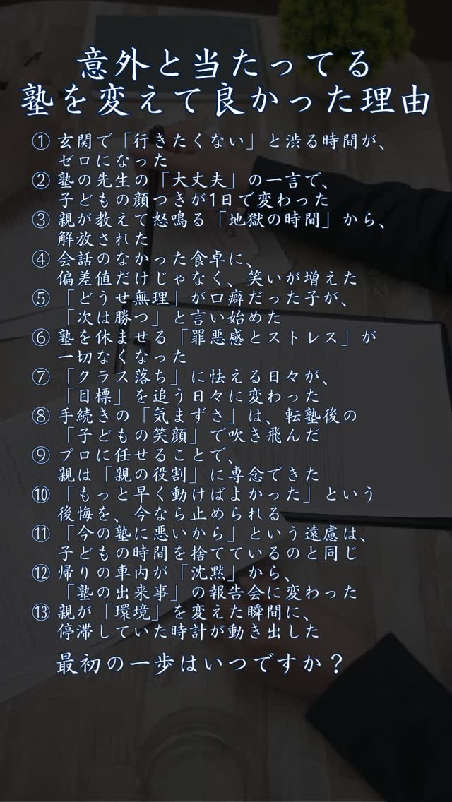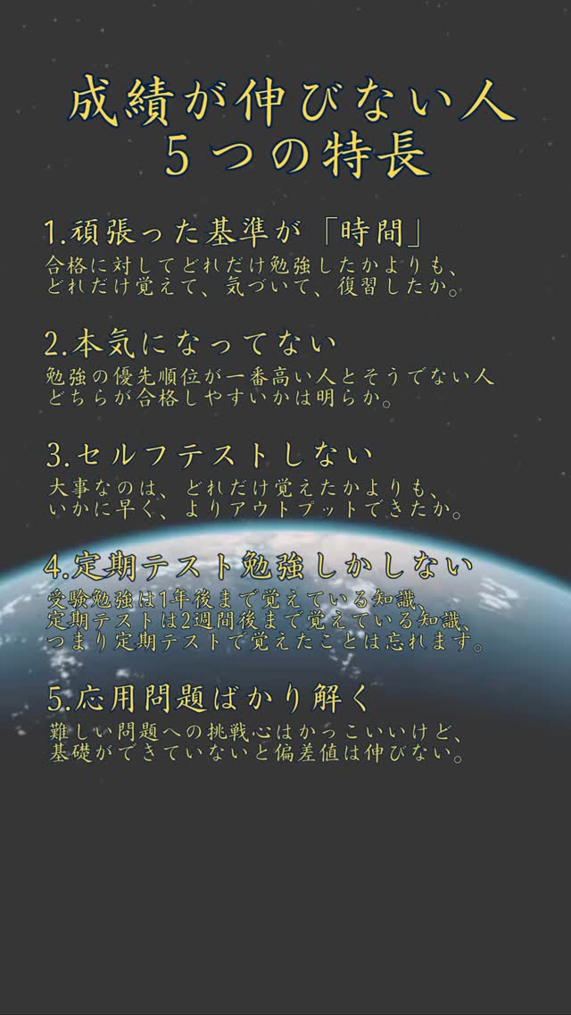 Instagram 「今の塾、このままでいいのかな…」 密かに差がつく小中学生の塾通い 「本当は、家を一番リラックスできる場所にしたいだけなのに アナウンサー直伝 魔法の言い換え術 言葉が変われば、未来が変わる 10代のうちにやっておくべき13のこと 10代の君へ、そしてかつて10代だった大人たちへ 成績が伸びない人「5つの特長」 1.頑張った基準が「時間」 学年1位の無意識な勉強5選 「頑張ってるのに成績が伸びない…」 学年1位のスマホルール7選 前へ 1 2 3 4 5 6 … 9 10 11 次へ